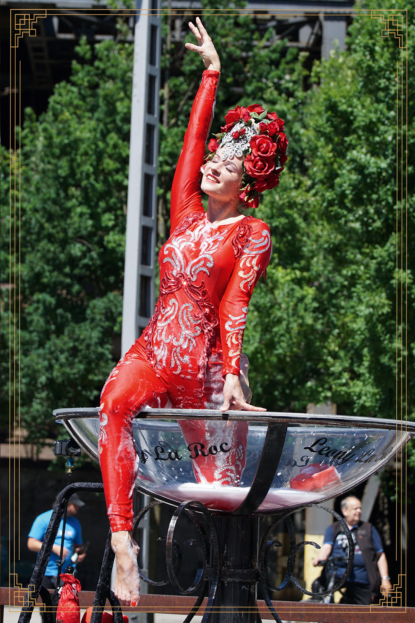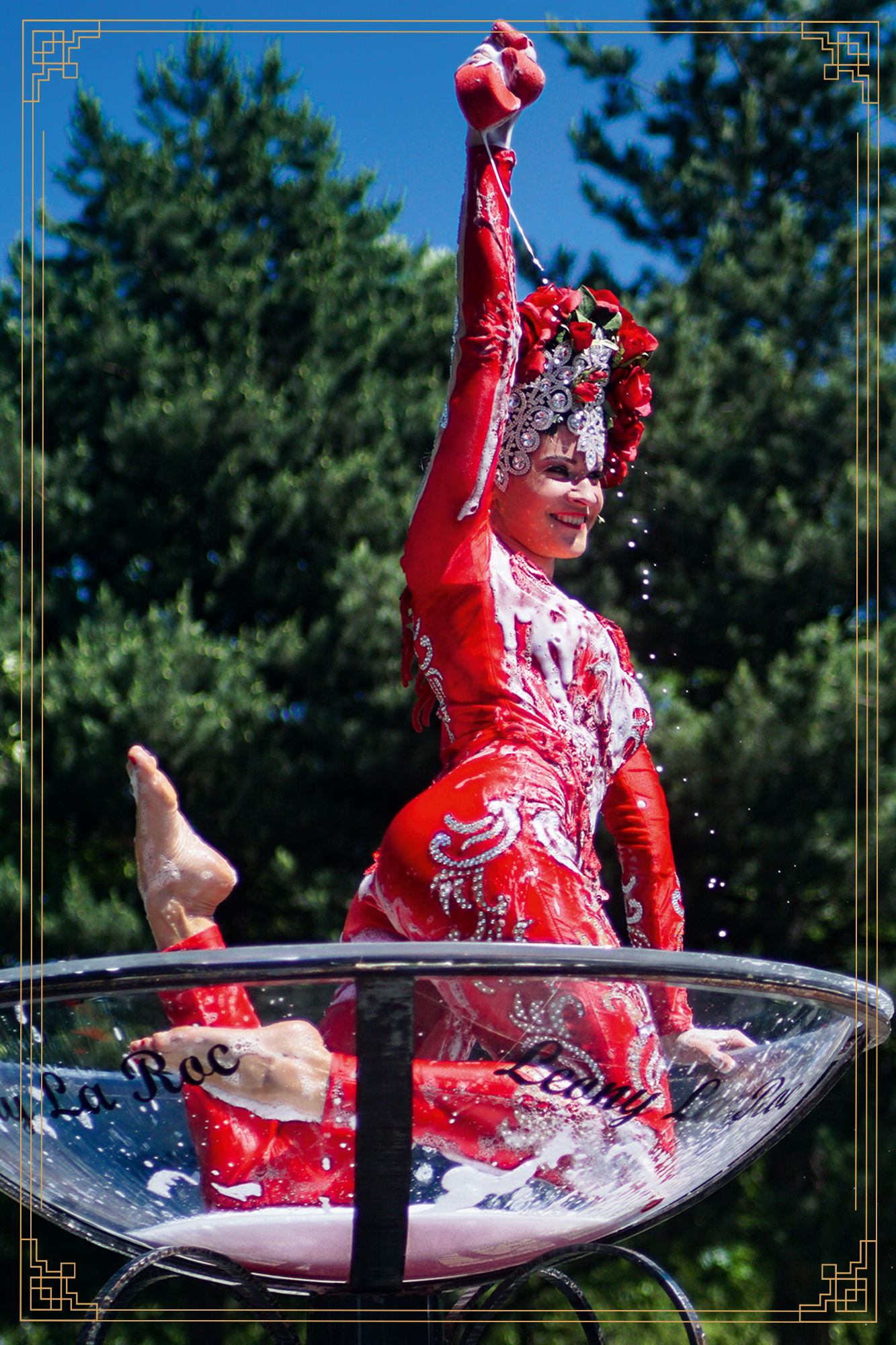 Erhaben, mit königlicher Kronen-Kopfschmuck, badet Leony la Roc im Champagnerschaum.