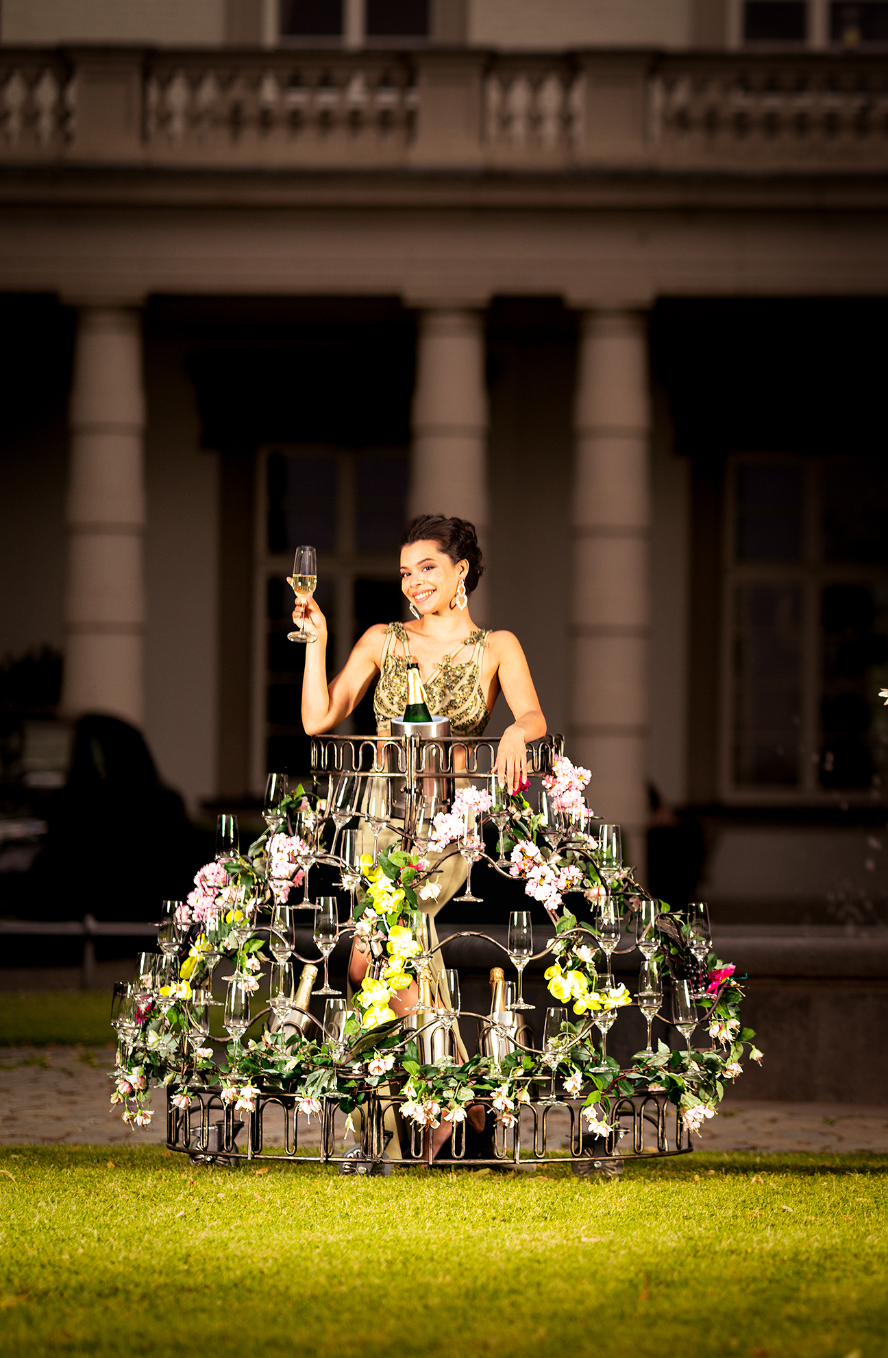 Direkt aus dem Kleid schenke ich frisch perlenden Sekt ein und verwandle den Empfang in ein unvergessliches Erlebnis, das von Anfang an für festliche Stimmung sorgt und jedem Event einen exklusiven Rahmen verleiht.
