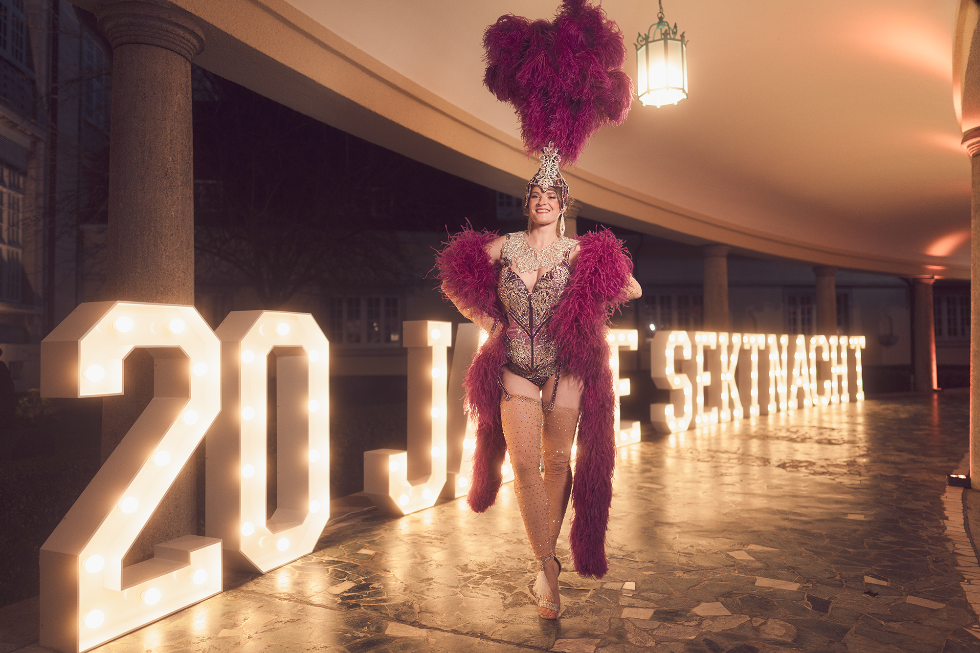 In meinem kunstvoll gestalteten Sektkleid heiße ich Ihre Gäste stilvoll willkommen. Je nach Anlass erscheine ich als funkelndes Showgirl, elegante Gastgeberin oder in einem thematisch abgestimmten Outfit – immer mit glitzernden Details, schillernden Accessoires und einem Hauch Extravaganz.