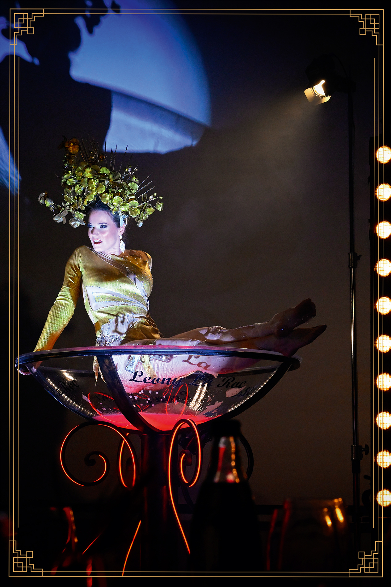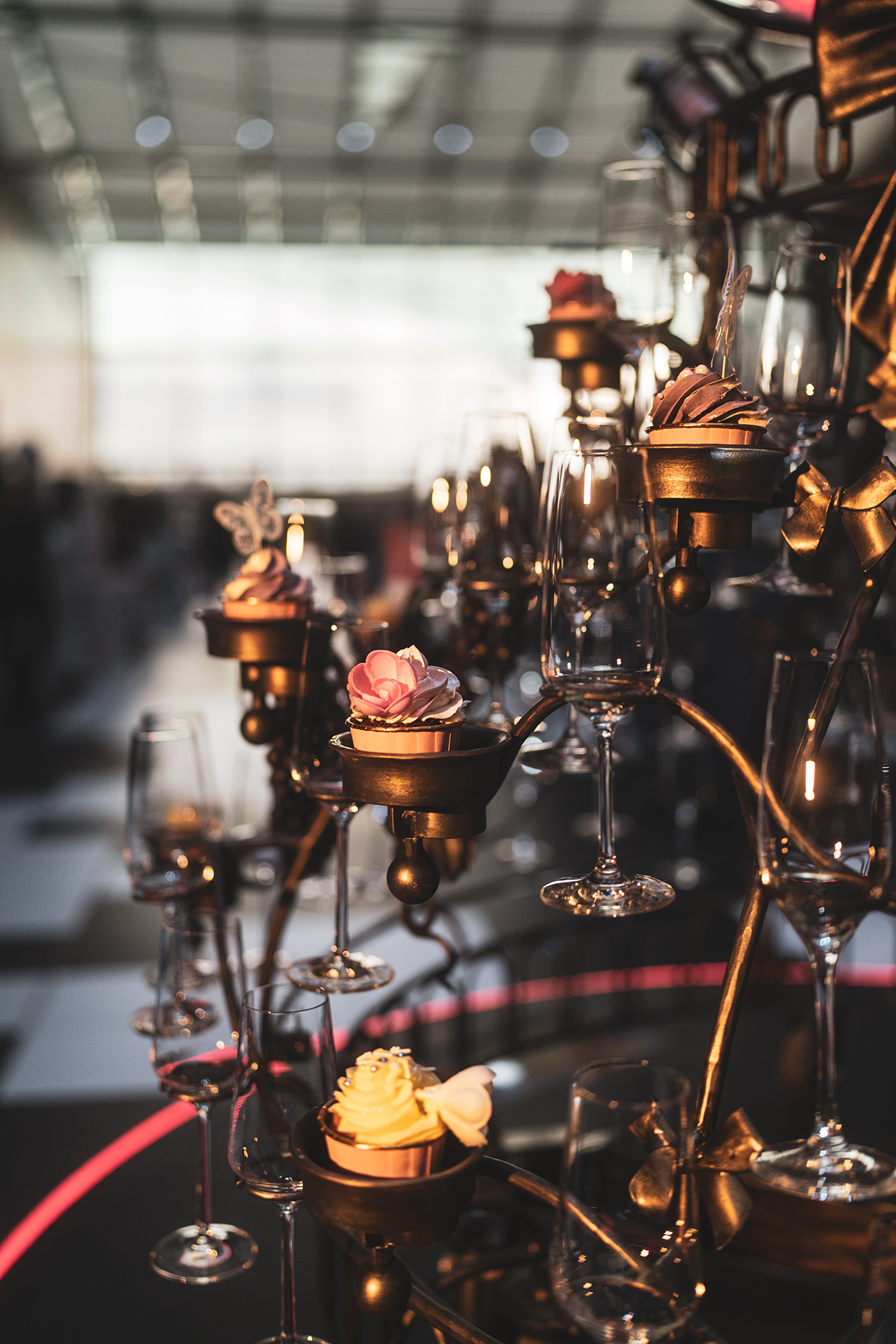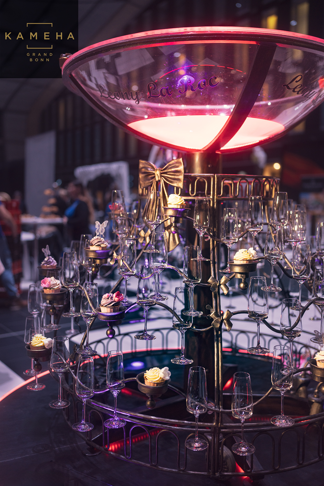 - Auf einer Drehbühne trägt ein XXL Champagnerglas das Sektkleid. Beleuchtet ist es eine Augenweide wie sich langsam die vorgefüllten Gläser oder das Dessert dreht