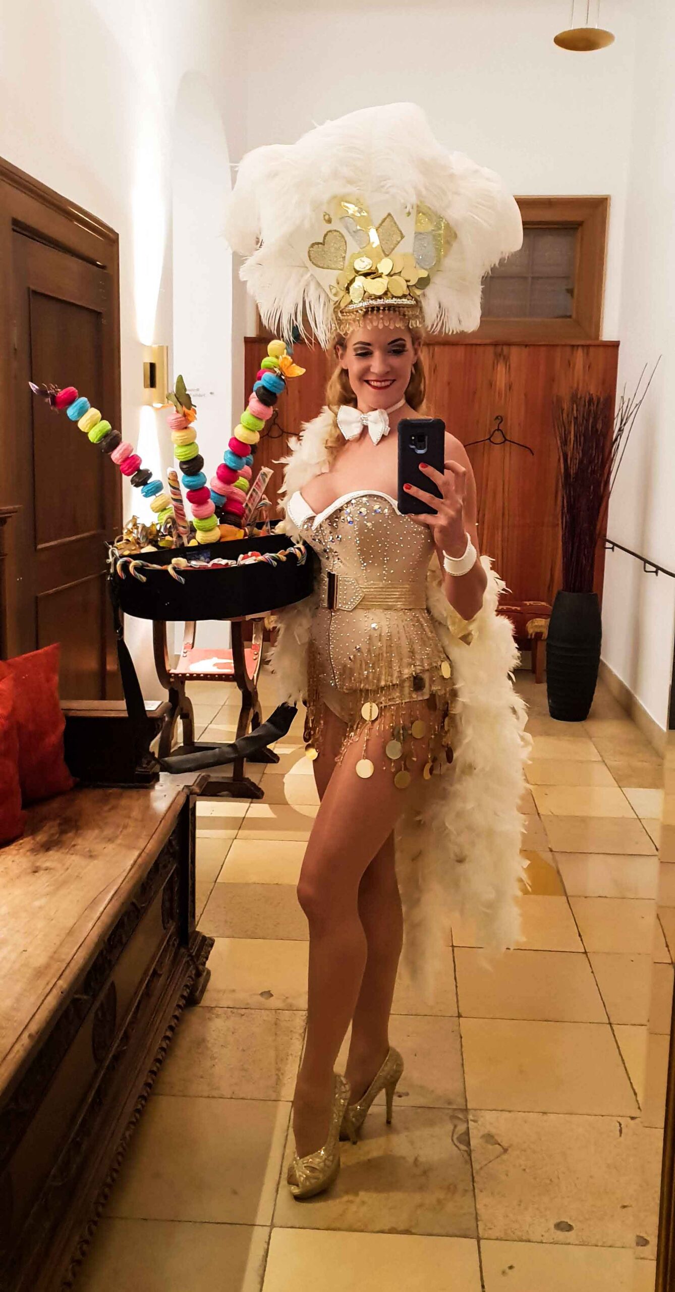 In einem prachtvollen Showkostüm begrüße ich Ihre Gäste, posiere für stilvolle Erinnerungsfotos und mische mich als charmanter Walking Act unter das Publikum.