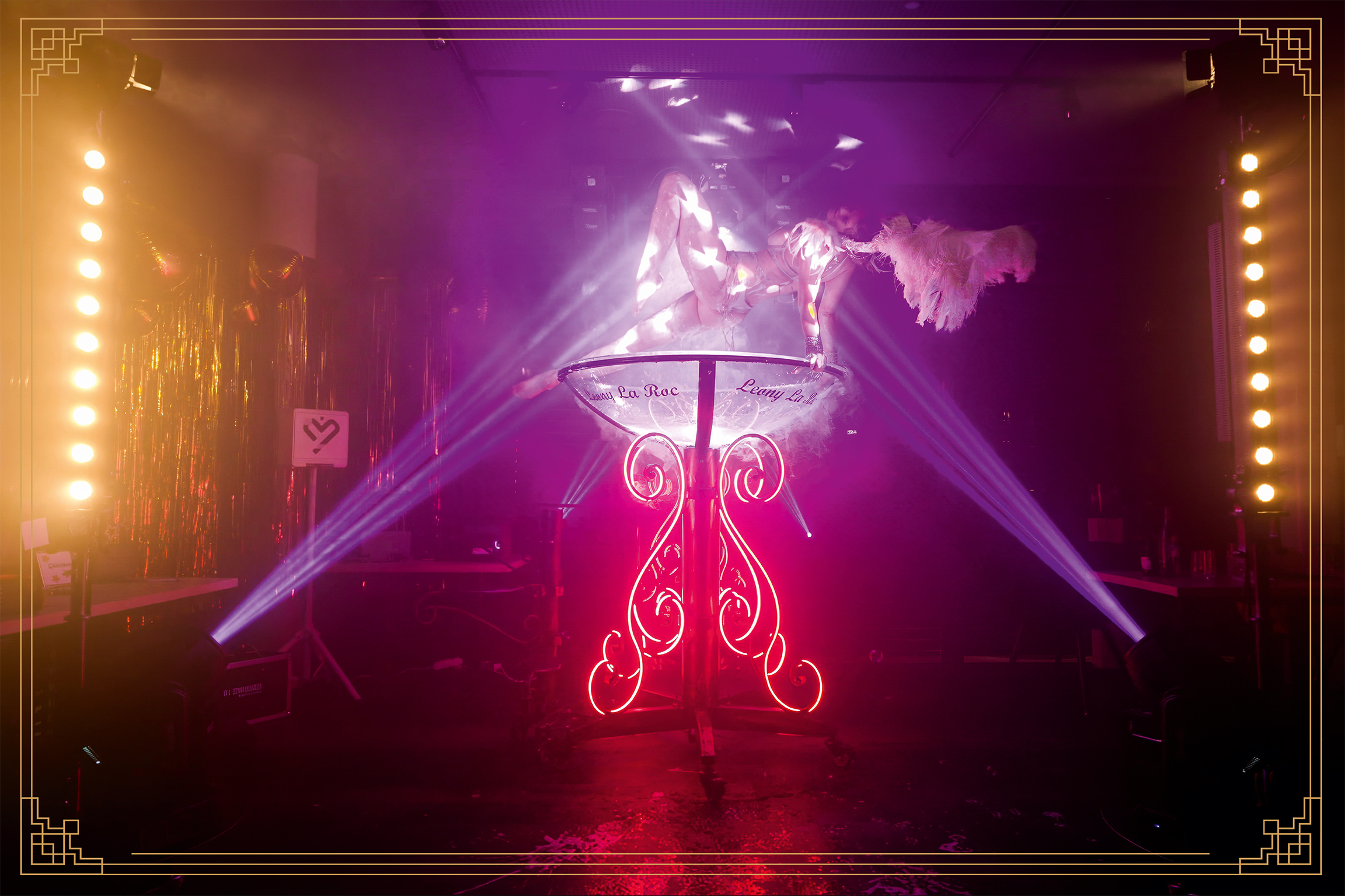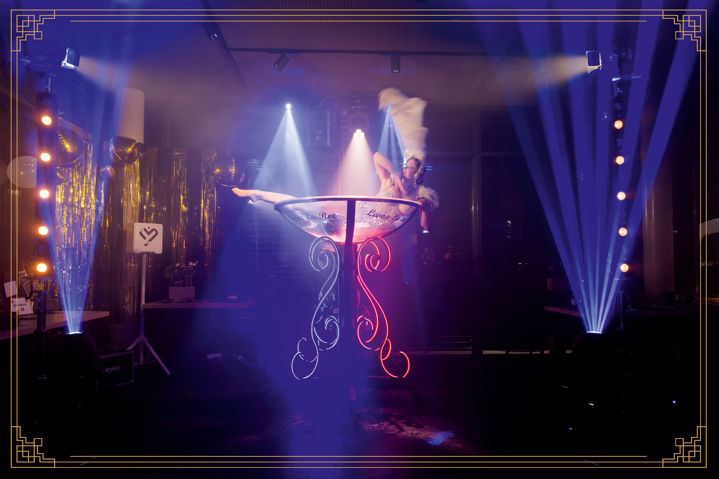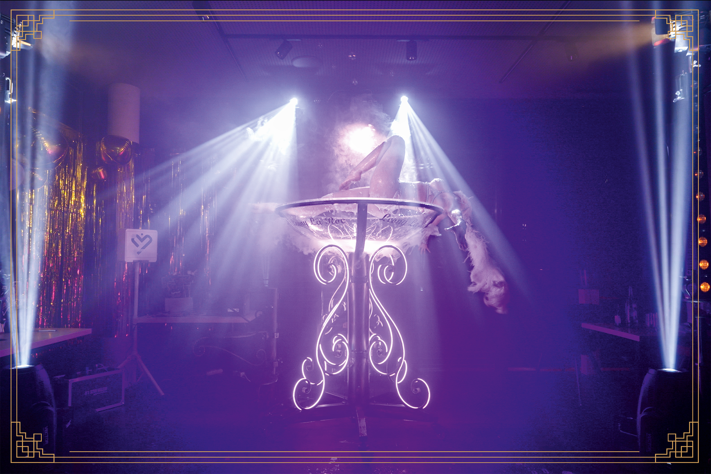 Und wer das Nonplusultra möchte, setzt noch einen drauf: Mit unserer Drehbühne erhält die Show eine spektakuläre 360°-Präsentation – das Glas dreht sich langsam, sodass alle Gäste den Auftritt aus jeder Perspektive genießen können.